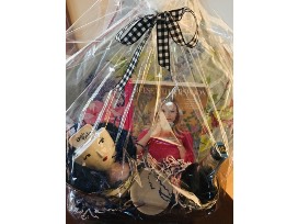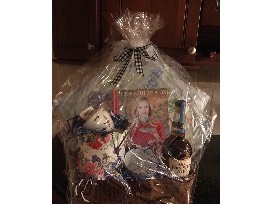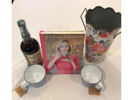 Includes the book "Whiskey in a Teacup" by Reese Witherspoon, a bottle of Old Forester whiskey, 2 teacups, 2 floral print pillows, and a floral container by Lori Siebert