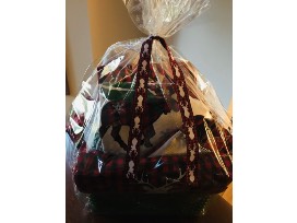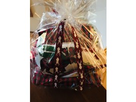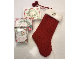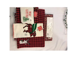 Includes a certificate for a live Christmas tree from Sugar Tree Farms in Seaman, OH (Value is $45.00 plus free decorating greens. Spruce, fir or pine tree up to 8 ft tall. Will bail tree and secure onto car if needed) ; a buffalo plaid holiday table runner, 2 placemats, pocket mitt, decorative towel, red stocking, 3 boxes of Christmas cards, and 2 round Christmas pillows