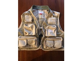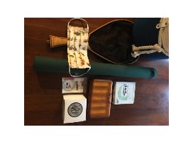 Collection of needed fly fishing gear. Includes Cabela's 8'6" 5 wt Stowaway 5 pc Fly Rod, Angler's Roost 5 wt Fly Reel, Cabela's Fly Line Backing, Cortland 444 Fly Line, Umpqua 9' 5 wt tapered Leaders (3 pk), Umpqua Fly Box, Custom Fly Fishing Net, Fly FIshing Themed Face Mask, Fly Fishing Vest.