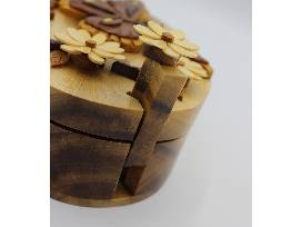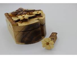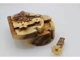 Hand-carved from recycled hardwoods, this puzzle box contains a removable locking pin which allows the top to slide off. Is sure to be a family treasure!