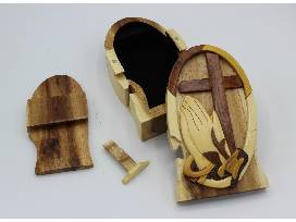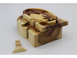 Hand-carved from recycled hardwoods, this puzzle box contains a removable locking pin which allows the top to slide off. Is sure to be a family treasure!