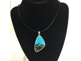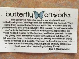 Made by hand from butterfly wings and sterling silver by Butterfly Artworks. They harm no butterflies in their process and their art is in the personal collections across the country.