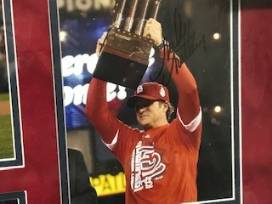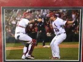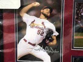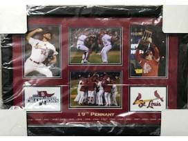 Up for auction is this amazing framed St. Louis Cardinals 2013 National League Champions 19th Pennant assortment of photos. Autographed photos of number 52 Michael Wacha and Mike Matheny are included in this frame along with a team celebratory photo and Molina and Rosenthal celebrating their victory. Don't miss adding this one of a kind framed piece of Cardinal history to your wall.