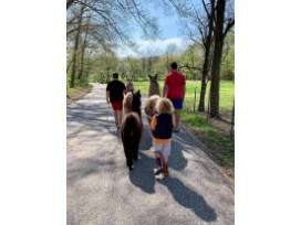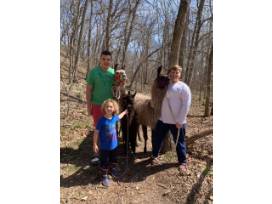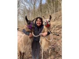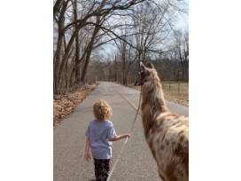 A family trek through the woods with Glow and Pebbles (llamas) and their alpaca friends.