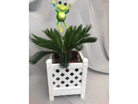 This lovely white lattice flower box will look beautiful on any front porch. Comes with a flower pot, a frog garden stake, and flower.