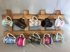 This coffee cup rack made by Tom Bourqeois of U&I Construction and holds 10 coffee cups. This rack does include 10 cups.