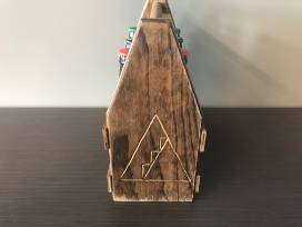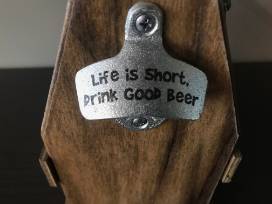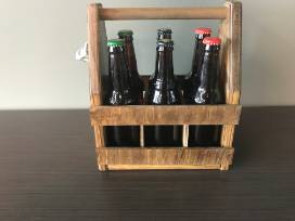 A Home-brewed six-pack and custom wooden holder with attached bottle opener.