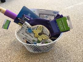 Our Executive Director Kate put together a "Kate's Survival Package" of all her favorite necessities she needs to survive anything! Items are pictured and Kate even made the blanket herself!