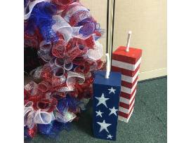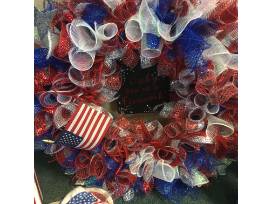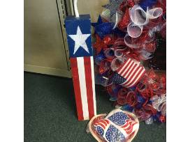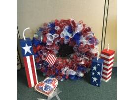 Show off your patriotism with this package! Includes a firework wreath for your door, homemade decorative fire crackers and a Longaberger heart plate with an American flag towel.