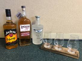 Kick back, relax and enjoy a drink with this package! Includes a hand crafted genuine whiskey barrel taster holder, 3 Glencarin Whiskey Glasses, 3 bottles of whiskey (1 bottle of Jim Beam Honey, 1 bottle of Limousin Rye, 1 bottle of White Owl).