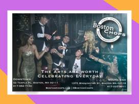 Winner will receive a 3-hour 30 guest cocktail party with passed hors d'oeuvres, beer, and wine at Boston Chops South End. Party in style in the Front Dining Room with exclusive Patio access (weather permitting)