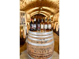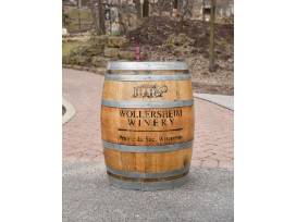 Wollersheim stenciled wine barrel signed by the owners and winemaker with assorted bottles of spirits and wine.