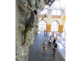 Basketball, volleyball courts and indoor rock wall