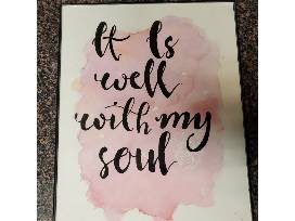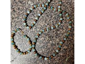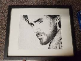 - One dot or stipple drawing of artist/actor Jared Letto, one ladder bracelet, a necklace and bracelet pair with blue chalcedony gold colored hematite and wood beads, and a watercolor with calligraphy.