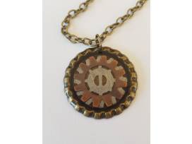 First, there is this handmade necklace using mixed metal gear patterns and enclosed in a bottle cap. The bronze chain is attached with an enlarged lobster clasp to make for a stylish look!