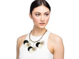 1Antique gold plated brass convertible necklace with black and melon details. Lobster clasp closure Measurements: 18.25" long with 2" extension chain, 4" bib drop by Lulu Frost.
