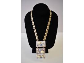 Named for the 60's style icon Mia Farrow, this long statement necklace pops with Mod aesthetic, featuring custom-made Czech Preciosa glass cabochons collaged together in an unconventionally chic way. Materials: Gold and silver tone plated brass, glass pearls, glass, resin, crystals Measures: 18 1/4" with 3 1/2? extender and retails for $388!
