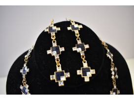 Materials include: Gold tone plated brass, crystal, onyx, and howlite.
