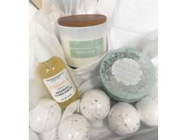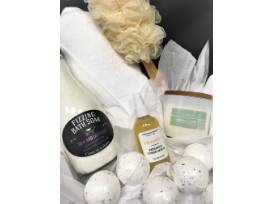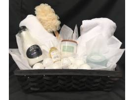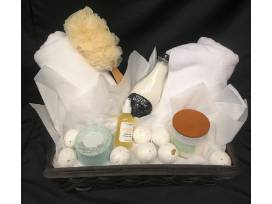 This luxurious basket will be a perfect gift for Mother's Day, a birthday or house-warming. Or, pamper yourself! The basket includes two 100% Turkish Cotton towels, an eco-friendly loofah, all-natural Vitamin E Repairing Toner Serum, Green Tea Eucalyptus scented bar soap, Milk and Lavender Fizzing Bath Soak, Lemon and Thyme Soy blend candle infused with essential oils and assorted bath bombs.