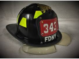 This is an official New York City fire helmet and is the same type worn by first responders on 9/11. The front piece has the number 343 which represents the 343 firefighters killed on 9/11. This helmet was donated by Bill Hayes who is in attendance tonight. Bill is both a PHWFF participant and the Regional Coordinator for New Jersey. He was among the firefighters who responded to the world trade center on 9/11. This item will also include a signed and framed photographed of the NYC firefighters in attendance tonight.