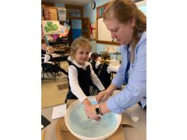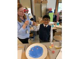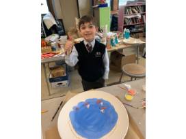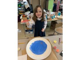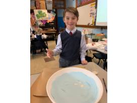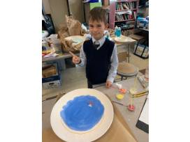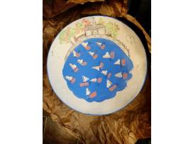 This platter depicts the Loeb Boathouse in Central Park and features finger print sailboats and signatures from each of Mrs. Pfennigwerth's 1st graders.