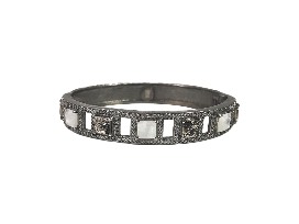 0Tat2Designs offers a Gunmetal plated bangle Sterling silver plated Indian Menander I square coins Custom cut square moonstone Clear crystal prong set frame Magnetic closure 2 1/2" inside diameter