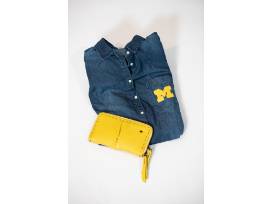 You will also look your best on game-day with this custom women's basket of items perfect for showing your team spirit. Package includes a hand-painted Michigan Denim Dress & a yellow designer Tsonga leather hand-stitched clutch/wallet.