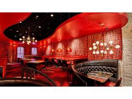 The Five Four Room, named for the year the original Diamond Jim Brady's opened, occupies the third-floor mezzanine and offers views to the second floor bar area below, as well as Main Street. A 222-inch motorized screen visible from the second and third floors can drop down during big your event, and another 100-inch screen is available for TV or presentations in the Five Four Room.