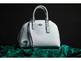 - A Coach Quinn Satchel in sky/silver/light blue, based on styles from the 1960s. Super lightweight, the dome-shaped polished pebble leather silhouette features a double zipper enclosure, double handles, a contrast lining, a three-compartment interior for organization, and protective feet. There are two outside pockets, one inside zip pocket, and one inside snap pocket. Approximate dimensions: width 13", height 9", depth 5 ½", handle drop 4", strap length 17" and is adjustable and removable.