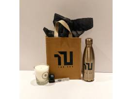 A gift bag is also provided with a water bottle, lip balm, hand sanitizer, and a candle.