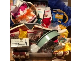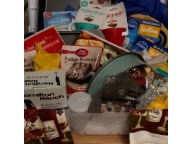 Items Include: large Wilton cake pan, Kate Spade apron, bun cake pan, Panera cookbook, Vegan Cookebook, Hamilton Beach Mixer, spring cake pan, donut pan, strainer, kitchen towels, measuring cups, silcone oven mitts, variety cake & brownie mixes, and MORE!