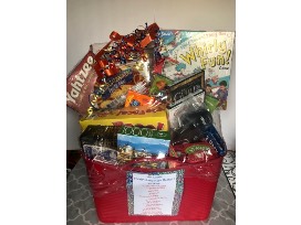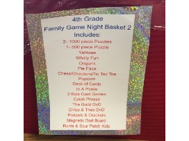 Mrs. Bliss & Mrs. Bruder's Family Fun Night basket filled with board games, cards, puzzles, movies, snacks, etc.