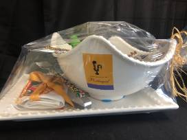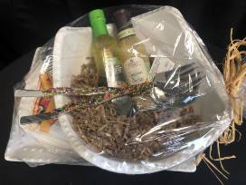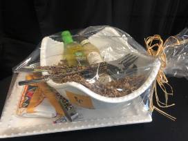 These beautifully hand-beaded tongs and salad servers are beaded with multi-color glass beads that will add a pop to your kitchen sets. The lovely set also includes Collitali Dipping Bread Oil, Stonewall Kitchen Sesame Garlic Dressing, a Vera Bradley Dish Towel and a Large salad bowl and platter.