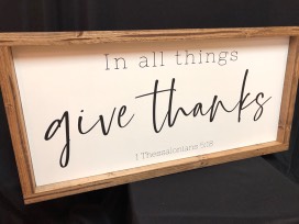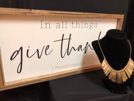 This sign is from Erin Kate Designs, an Etsy store based out of Newnan. It reads, "In all things, give thanks. -1 Thessalonians 5:18." Also included is a lovely gold metal fringe necklace from Lizard Thicket.