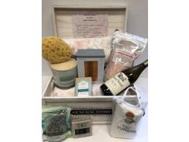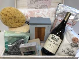 Take time for you! This Relaxation Basket includes an ultra-soft throw, candle, bath salts and soaps, essential oils, bath brush and sponge, hair turban, and a bottle of Chateau Ste. Michelle Pinot Gris.