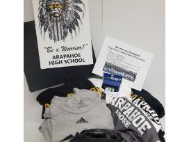 This extensive package includes everything you need to "Be a Warrior!" Includes an Arapahoe Warrior Football Game Day Package with two (2) AHS football hoodies, two (2) AHS football t-shirts, two (2) AHS football visors, four (4) tickets to the Friday, September 13, 2019 football game vs. Heritage High School, and four (4) all-access passes to the game. All-access passes allow access to the field and the locker room before, during, and after the game. The basket also contains assorted shirts, hats, visors, and other swag from the AHS soccer, track and field, lacrosse, volleyball, cross country, cheerleading, and Toms programs and a $50 gift card to Dick's Sporting Goods in case you need more stuff!