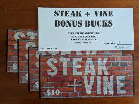 5 Gift Cards for $10 each, total of $50.00 to use at Steak & Vine Restaurant in LaGrange.