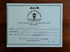 A $15 Gift Card towards Al's Char Steak House and Saloon, in downtown LaGrange.