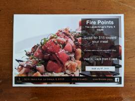 A $15 Gift Card towards a meal at Fireside Pizza.