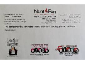 2 Tickets to one of the following shows: Late Night Catechism, Bible Bingo, or Christmas Bingo.