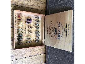 Vintage angler package. Includes 24-inch custom-made, laminated wood trout net. 24 Steelhead Flies tied by Ed Ingold, classic single and double hooks in Te Amo cigar box. 2 Salmon flies mounted in a glass dome (3" x 4" high) - "Lord Iris," Al and Gretchen Beatty. January 1993. Out-of-area buyers are responsible for shipping costs.