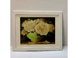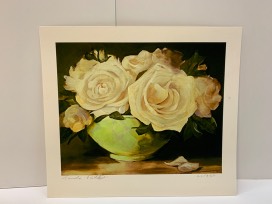 Linda Potts Rose Print, 13' x 11.5', framed. Linda Potts, a graduate of the Ontario College of Art, is a Muskoka-based artist whose artistic versatility allows her to create bold and dramatically colourful images. Linda's versatile artistic expressions can be placed in a wide variety of settings. Linda's work celebrates the various seasons through colour, light patterns and setting. All of her paintings have a strong sense of atmosphere. Value $300.
