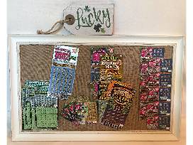 Lucky Lottery Corkboard of $100 assortment of Florida Lottery Scratch Offs
