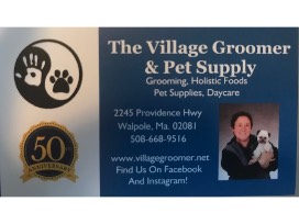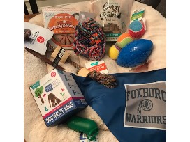 Enjoy a $50 gift card to be used on Grooming Services at the Village Groomer & Pet Supply along with tons of dog items donated by www.chewy.com which includes a medium round bolster bed, dog toys, treats, and clean-up bags and dispenser and a fabulous FOXBORO bandana!