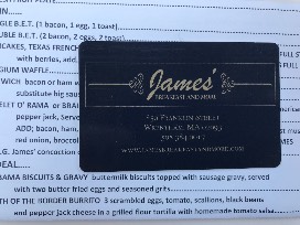 Gourmet breakfast and lunch! Come by yourself or bring the entire family. With the best home fries in town, and a wide assortment of eggs, meat, breads and fruit, there is something for everyone at James'.