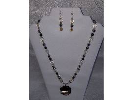 One of a kind jewelry set featuring a stunning black tiger's-eye pendant, paired with hematite, crystal, glass and metal beads. Necklace is 21" long and features a easy to use magnetic clasp. Pierced earrings are on nickel-free silver plated hooks and measure approximately 2". Handcrafted by a local artist, these unique pieces are sure to make a statement.
