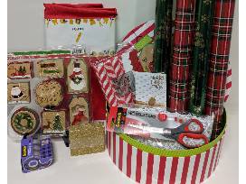 This package includes wrapping paper, a gift wrap organizer, tape, scissors, name tags, tissue paper, gift box, and more! It also includes a $40 gift card to Hobby Lobby.
