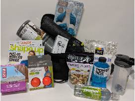 The Weight is Over! fitness basket includes gym bag, earbuds, yoga mat, foam roller, massage therapy balls, water bottle, towel, protein powder, snacks, and more. Also includes a $25 gift certificate to Academy Sports