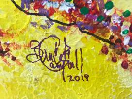 Large tree painting on yellow canvas.