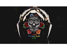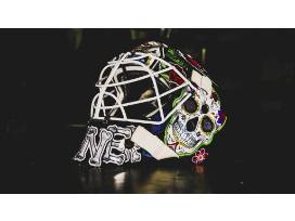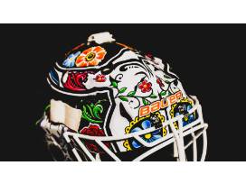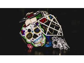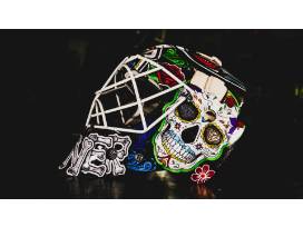 This game-worm Chimuelos goaltending mask was debuted by Jordan Binnington on November 23rd during a 4-1 win over the Texas Stars, the first win for 'Los Chimuelos'. Binnington's custom-made mask is decorated with the Chimuelos sugar skull logo and floral patterns. Across the chin written in bones is his locker room nickname 'Binner', commonly heard prior to his rise with the St. Louis Blues when 'Winnington' became a household phrase. On the back of the helmet is the date of the original Chimuelos game, October 26, 2018.